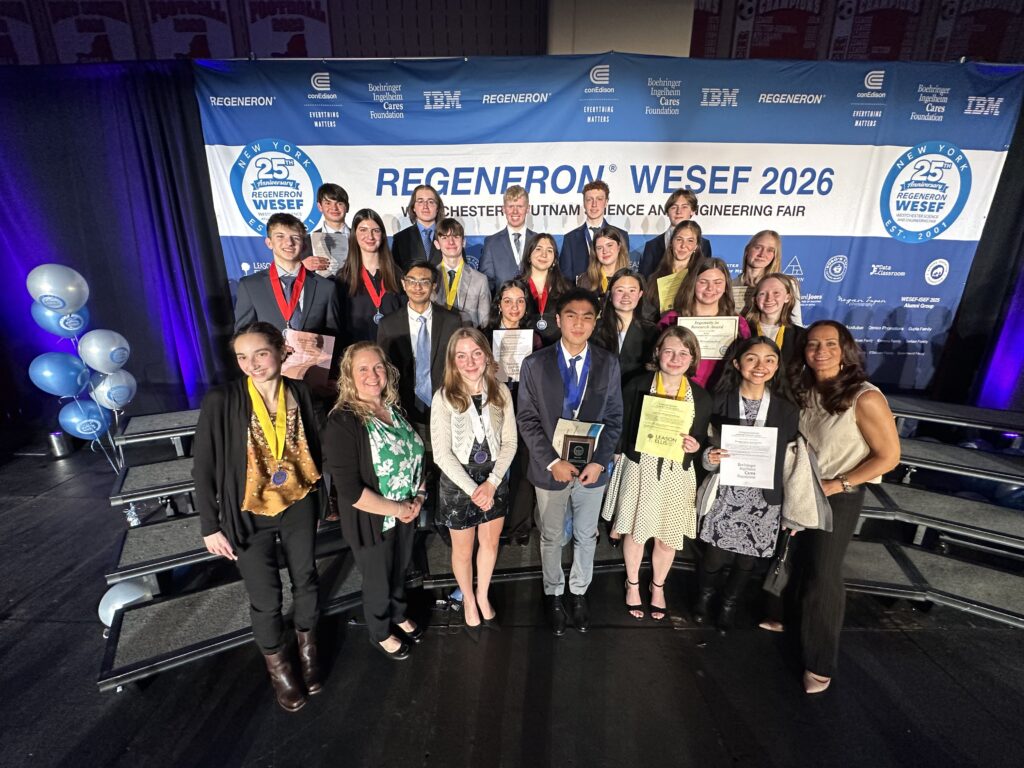 A group of 43 juniors and seniors from Irvington High School participated in the 25th annual Regeneron Westchester Science & Engineering Fair (WESEF), held at Somers High School on March 14. They were among more than 800 students from more than 40 high schools to showcase their research and have their work judged by local experts in the field.